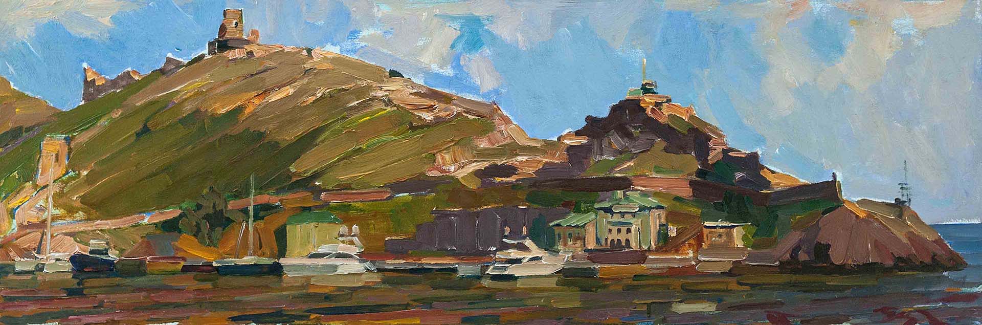 Vladimir Kuts has travelled all around the Black Sea and the Azov Sea coasts and reflected every favourite nook on his canvasses, such as Gourzouf and Feodosiya, Bakhchisaray and Khersonesos, Kerch and Sevastopol, Kazantip and Soudak… Yet, Balaklava remains his favorite “plein air” site – Vladimir depicted practically all angles of the neighboring mountains, capes, the bay, sights of the Genuezskaya fortress, old architecture ensembles and other buildings. Nevertheless the Balaklava landscapes are never repeating themselves, they are as much diverse as changeable the nature itself is. “Balaklava is a magic place; its scenery is full of artistic images. The bay’s structure urges on perception of these images, – the artist notices. – One only needs to see, feel and accentuate them…”
